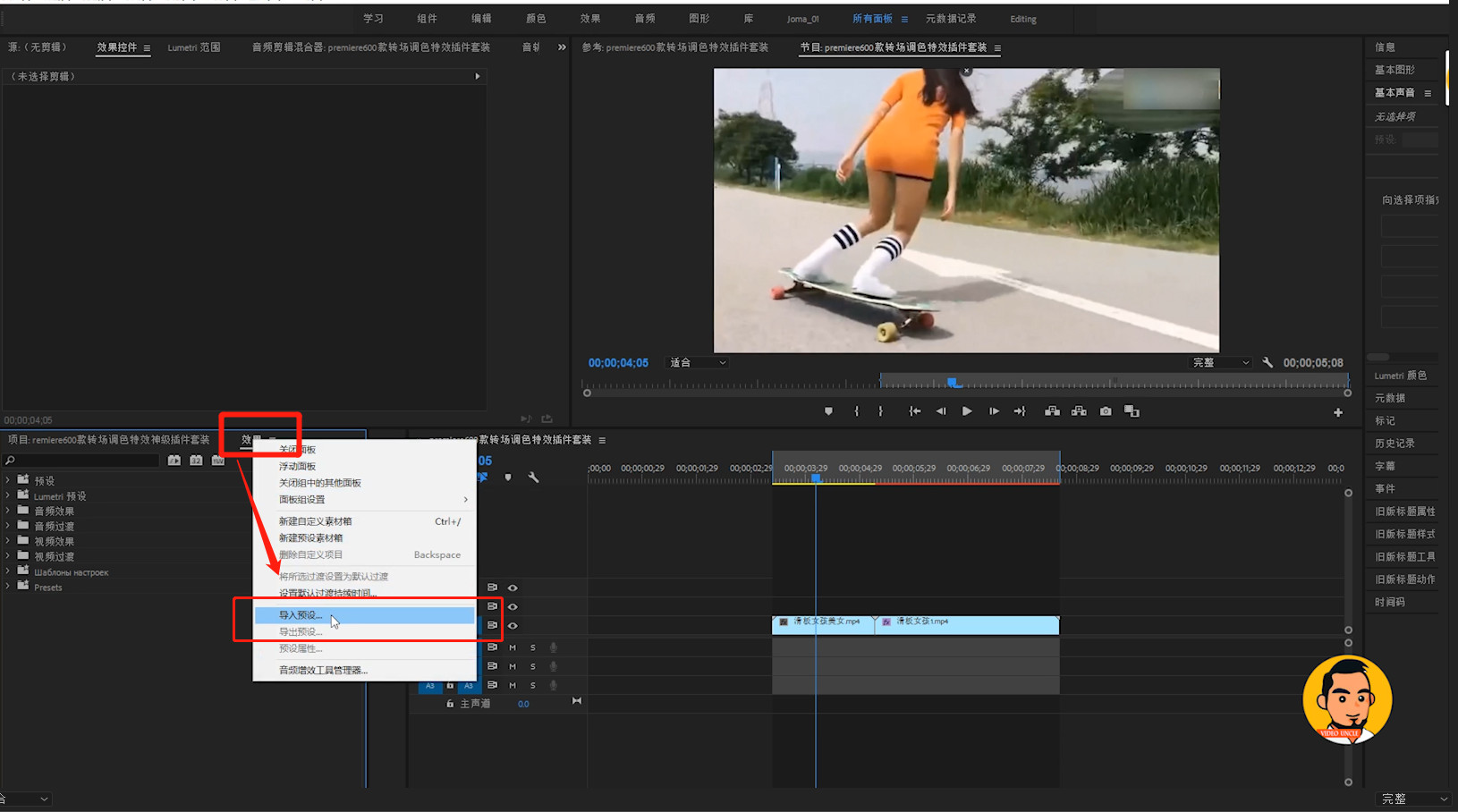 1、效果面板-导入预设-选中插件预设-双击导入即可!