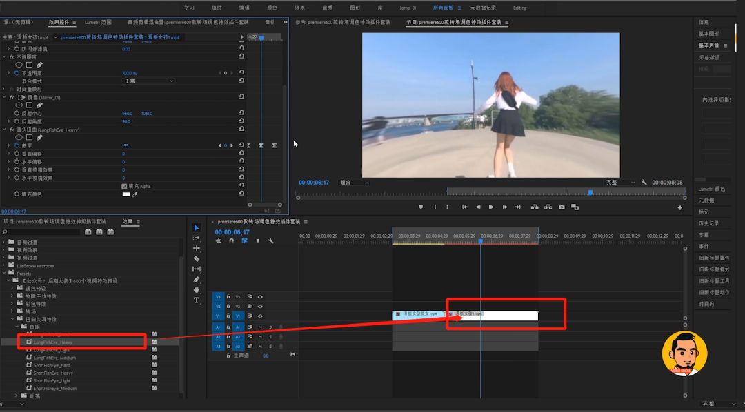 1、找到特效插件譬如:(扭曲失真特效-鱼眼镜头),拖入至素材镜头即可(如下图示意)