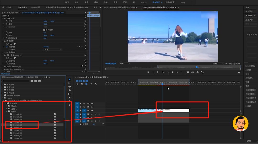 1、如下图,效果-调色预设-选一个效果(如:电影风-cinematic 05)加入素材即可!