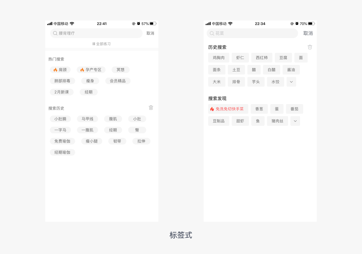 中间辅助区:主要包括“历史搜索”和“热门推荐”两部分内容。常见样式有以下几种: