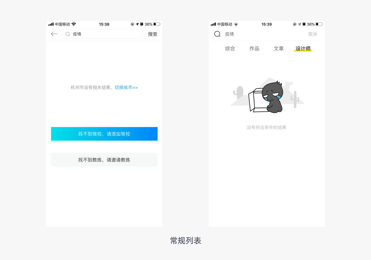 搜索结果通常分为常规列表、带有筛选排序功能的结果列表以及搜索为空的页面。