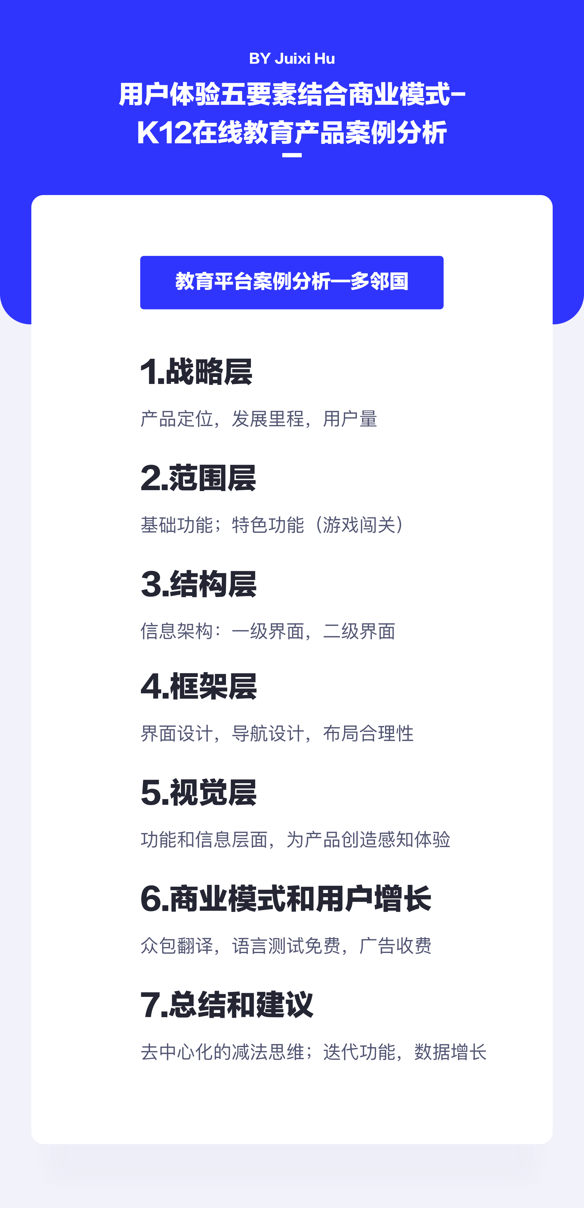 3 分析多邻国,我们采用的用户体验五要素分别为:战略层、范围层、结构层、框架层、表现层。