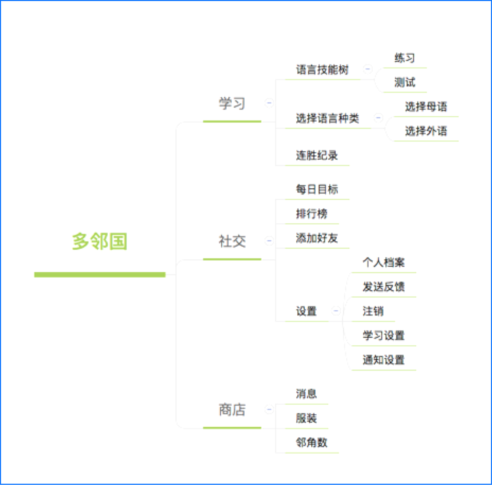 多邻国结构设计极其简洁,一级界面仅有四个,分别是:学习、练习、语言圈、邻角小店。每个界面没有二级导航,从一级界面最多延伸到二级界面,大量通过模态视图做功能过渡,整体上采取扁平化设计,每个界面按主次,平铺为数不多的功能,几乎没有任何多余的界面功能。