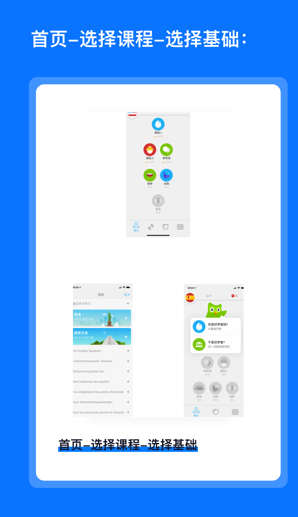 开始-选择母语-选择外语-判断当前基础-分为两条线: