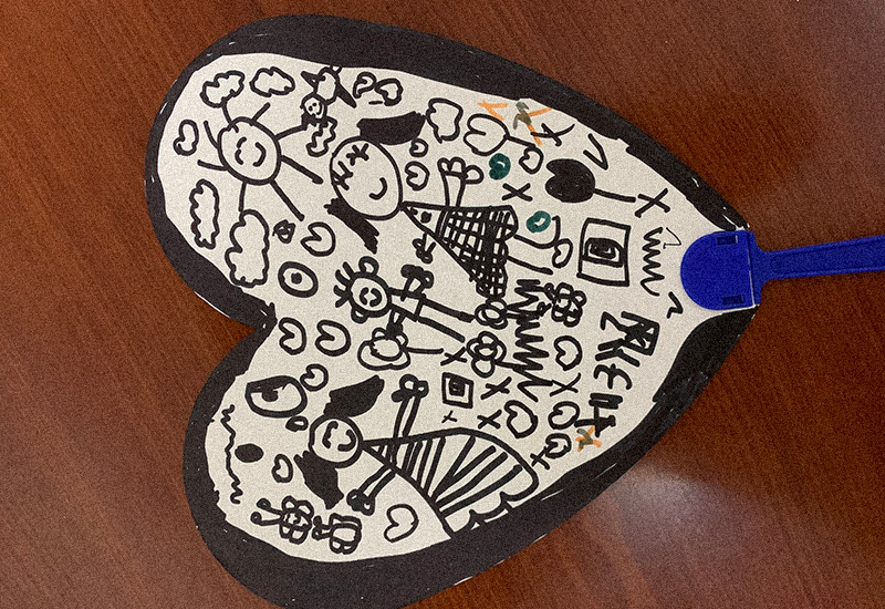 所以我们再来看看小孩子画的画,这里例举我女儿的画,今年父亲节女儿从幼儿园给我带回来一份礼物,就是老师让其在一个空白的扇子模型上画画,主题我估计大概就是“爸爸妈妈与我”之类,原作在此: