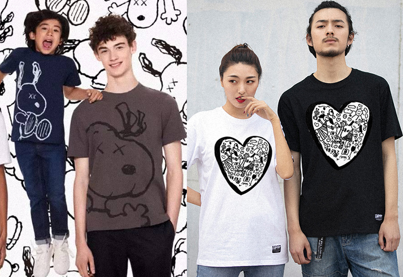 如果我们将其放在一个大型商场上,然后印上大品牌logo,宣传为“设计大师合作款”,跟以下这些真实的优衣库与新泽西涂鸦大师考斯(Kaws)合作的T恤放在一起销售,我感觉卖出去是那么的理所当然。