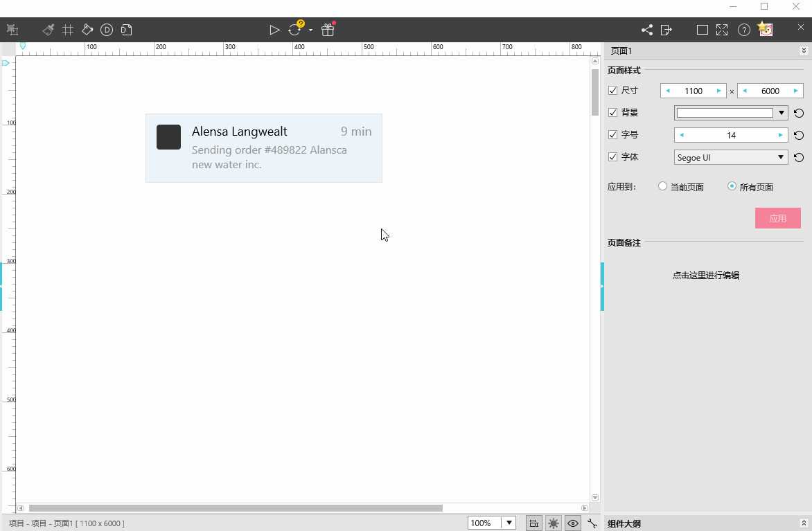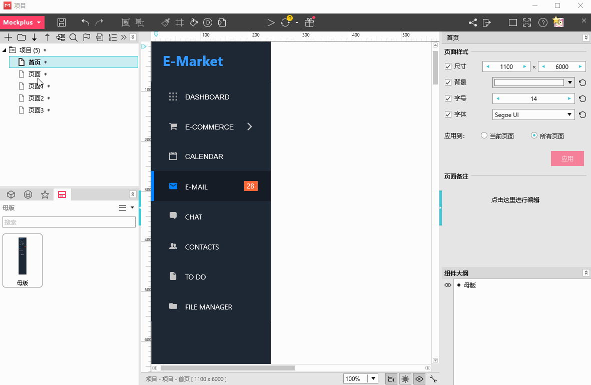 ③ 将母版从左侧母版管理中拖入工作区即可应用到项目中的任意页面中;