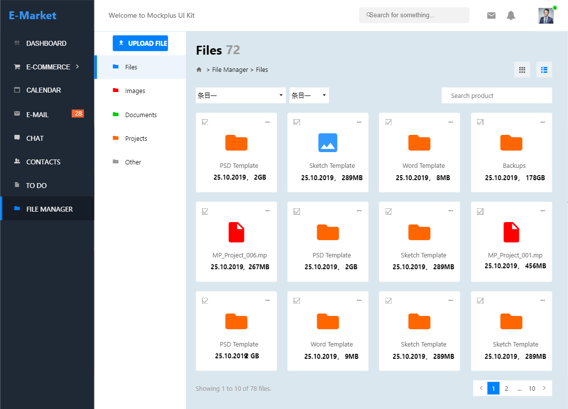 卡片式设计是E-Market电商管理系统原型的设计亮点之一,使用矩形+图标+单行文字组件即可组合成卡片。使用上文中提到的快速格子功能,即可快速完成文件管理页面的设计。