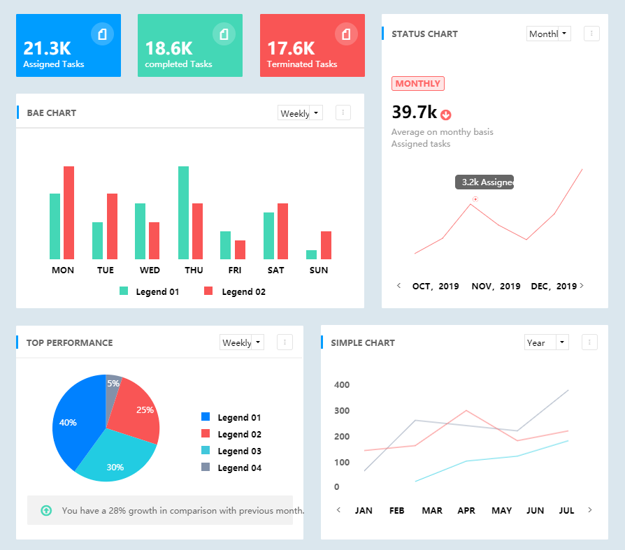 Dashboard页面主要使用了Mockplus的图表组件搭建而成。Mockplus提供4种可直接使用的图表组件:柱状图、条形图、曲线图、饼图。在这款原型中,使用了柱状图、曲线图和饼图三种组件。