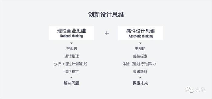 创新设计思维是在设计思维基础上结合商业思维,把客观的、合理的、按照逻辑推理的商业模式,与追求美好愿景的新体验的设计思维紧密结合起来,寻找两者之间的平衡。