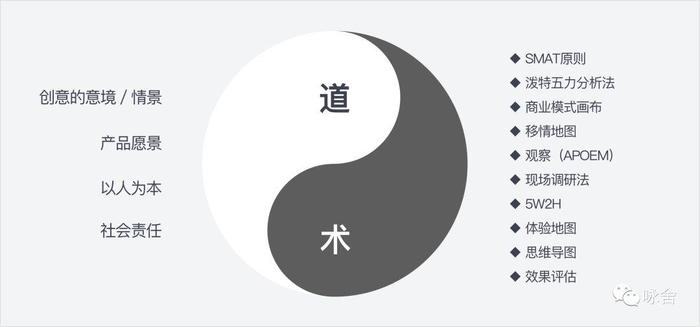 形而上就是道的“灵魂”,形而下谓之器,“器”在这里可以理解为“术”。在设计中“道”是利用人的情感和心态,建立价值观,属于右脑思维;“术”强调的逻辑和推理,分析工具、技巧、规划商业战略等。