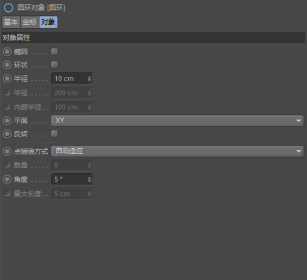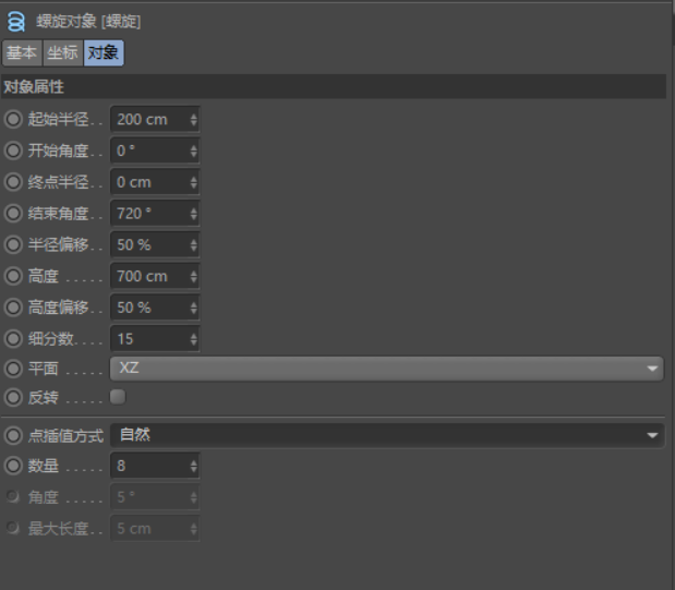 2.在“螺旋”窗口中,选择“对象”,将“半径”修改为“10cm”,其他参数修改如下图。