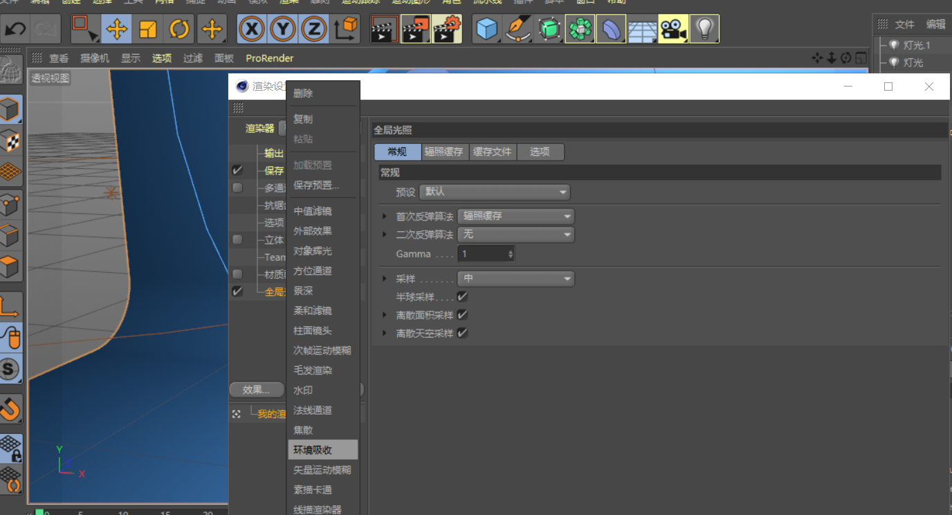 10.选择上方渲染设置,在下面效果里面选择环境吸收。