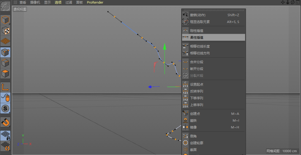 4.在点的编辑模式下,选择其中一个点,按【ctrl+A】选中所有的点,鼠标右键选择“柔性插值”让线条更顺畅,再次调节手柄。