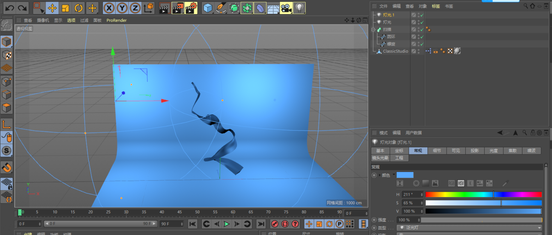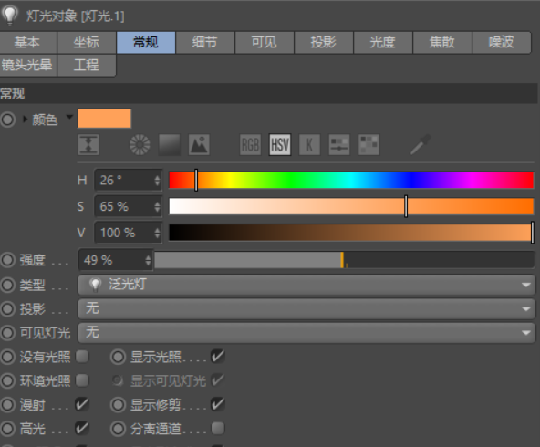 2.为烘托画面气氛,在灯光的“常规”设置里面调整灯光的颜色H:211S:65V:100,可根据画面调整自己喜欢的颜色,在“细节”窗口里面,将衰减改成平方倒数,过度非常柔和。