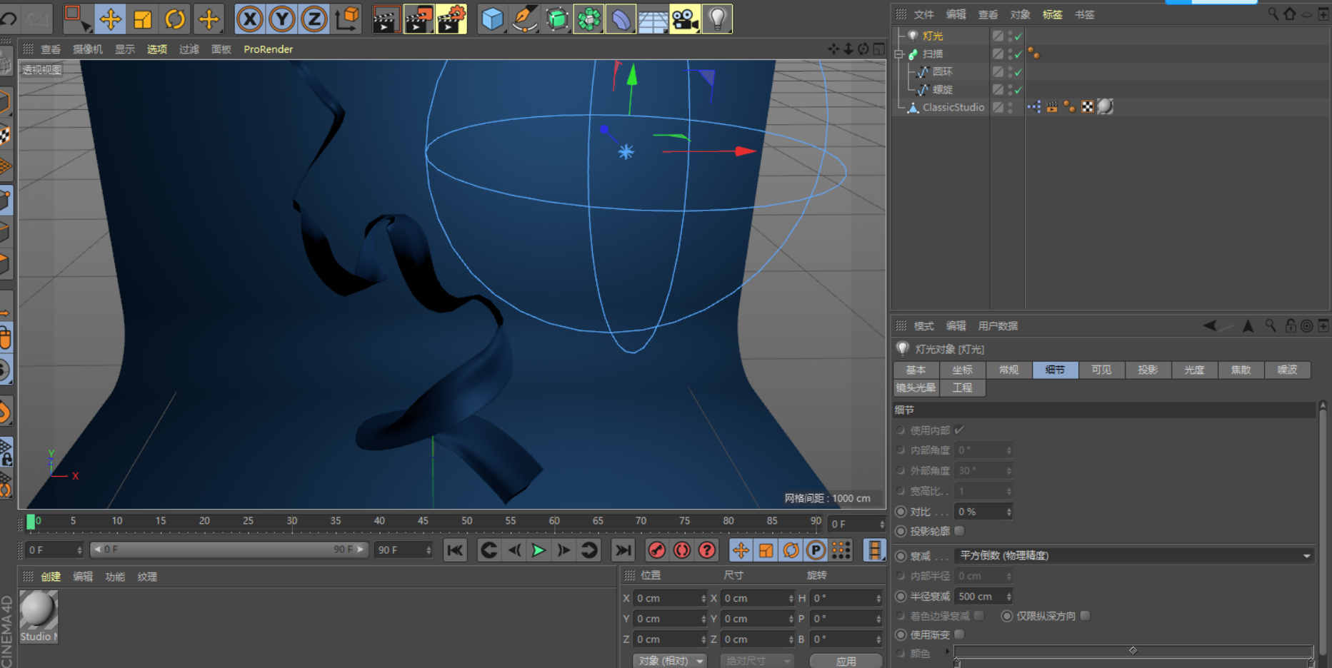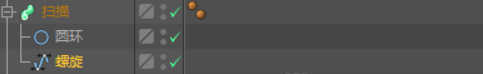 7.在对象窗口中,将“螺旋”‘圆环’拖曳至“扫描”内,注意圆环在螺旋的上面。