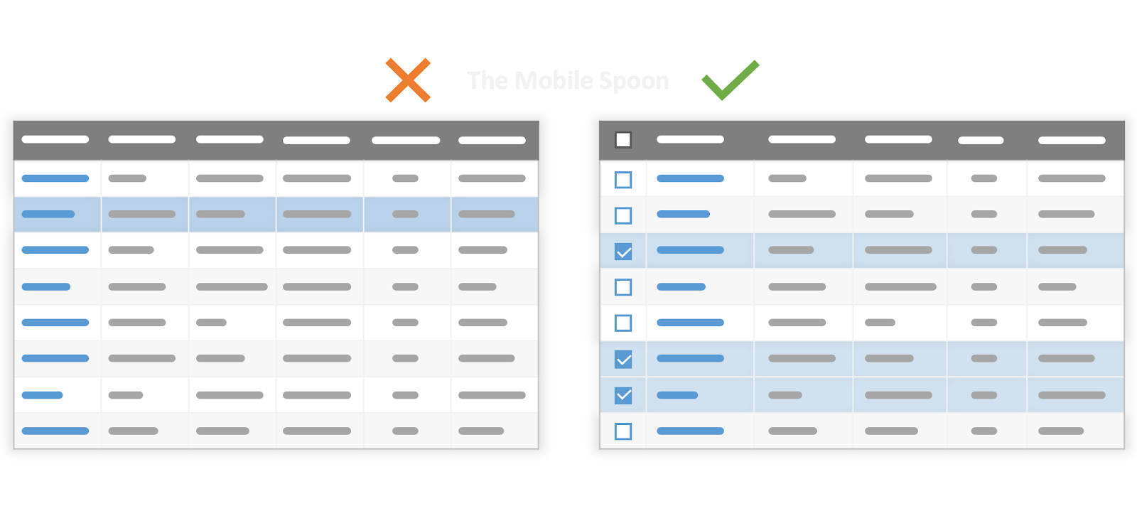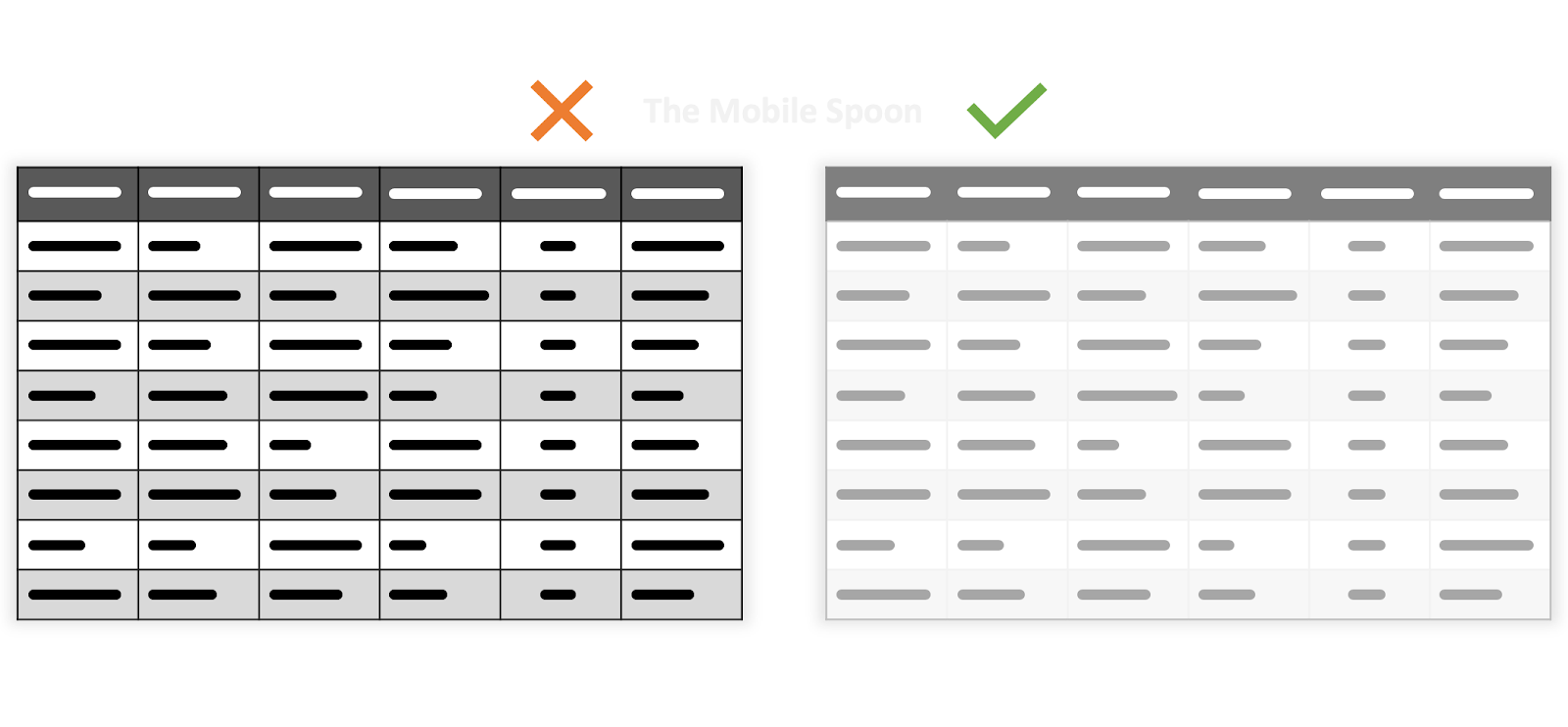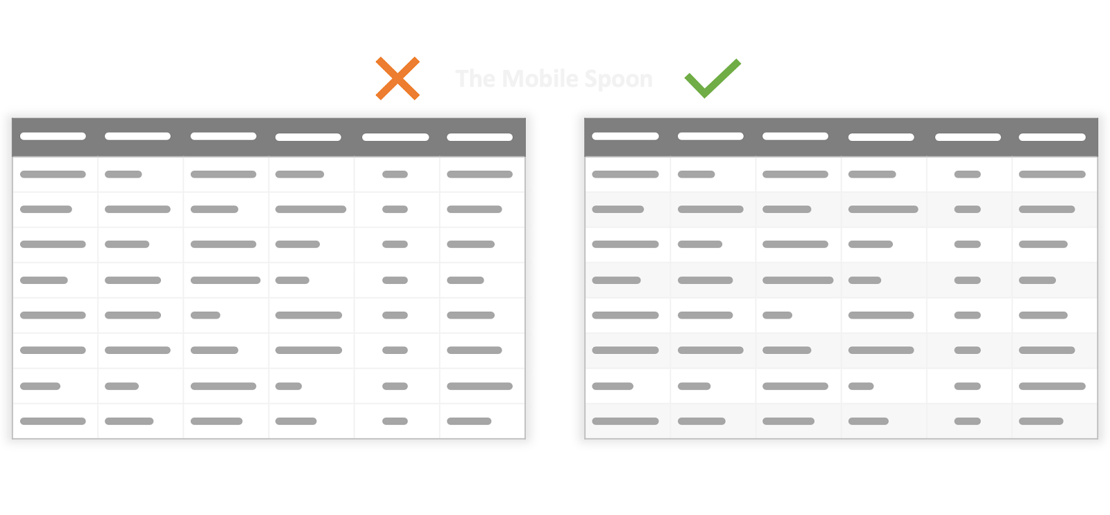 斑马纹的表格可以帮助用户保持其位置,但是彩色的行必须非常浅,否则会引起误导,看起来像选定的行。