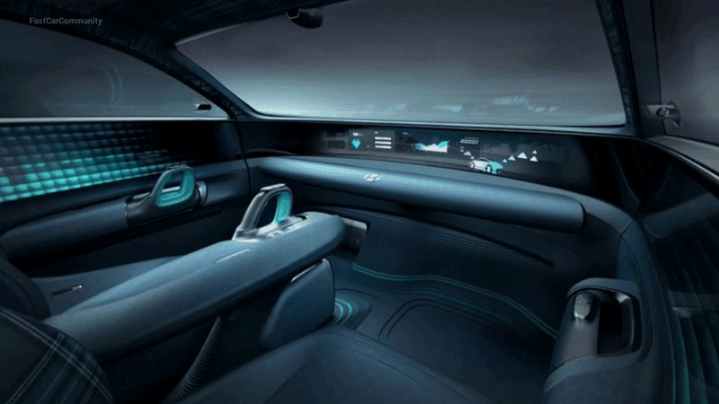 在内饰设计上,新车采用了环抱式设计。U形方向盘+贯穿式仪表(用于显示导航和信息娱乐相关功能)+增强现实抬头显示功能+虚拟外后视镜(仪表台两侧的显示屏用于显示外后视镜摄像头所拍摄到的后视画面)+四座布局(配有专属屏幕,同时,中央扶手处,可读取驾乘人员手势操作,并予以触感反馈(3D超声触觉控制技术))+IRIS的人工智能语音助手等。无不体现着未来出行理念。