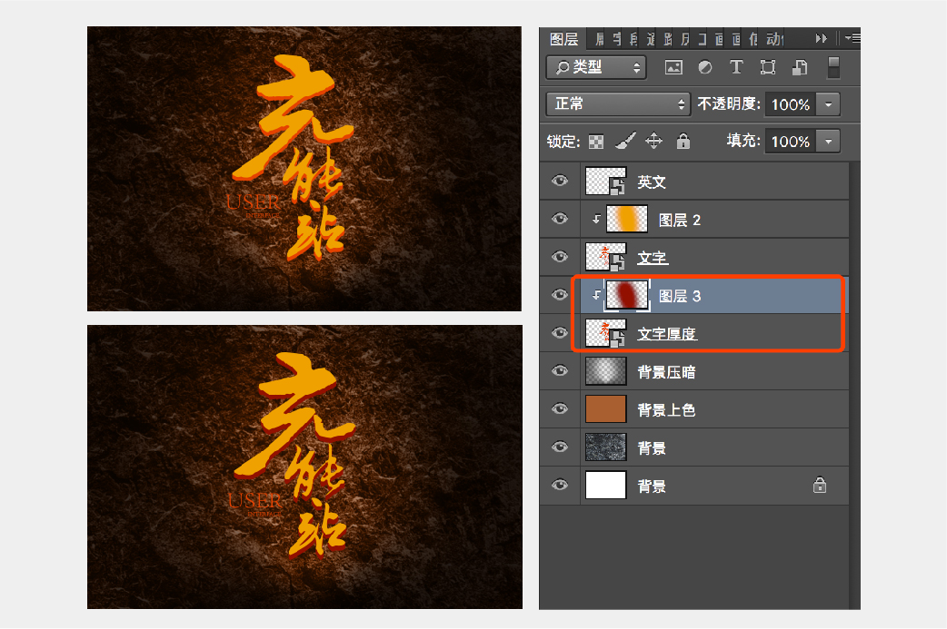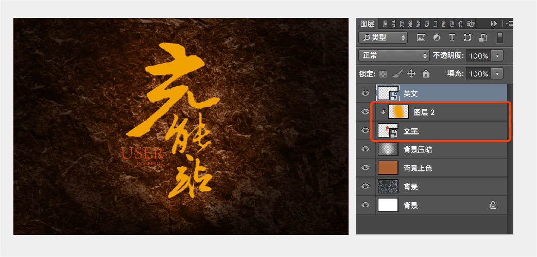 (1)打造背景。为了打造一种光影立体效果,我们选择用岩石素材打造深色背景,四周暗,中间亮,突出文字主体。