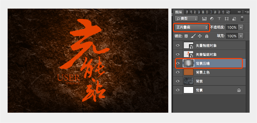 为了更加突出文字主体,我们将文字四周的背景压暗,在“背景上色”图层上面新建一个图层,命名为“背景压暗”,将图层混合模式改为“正片叠底”,颜色选择黑色,调整为合适的不透明度,用画笔在背景四周进行涂抹,效果如下: