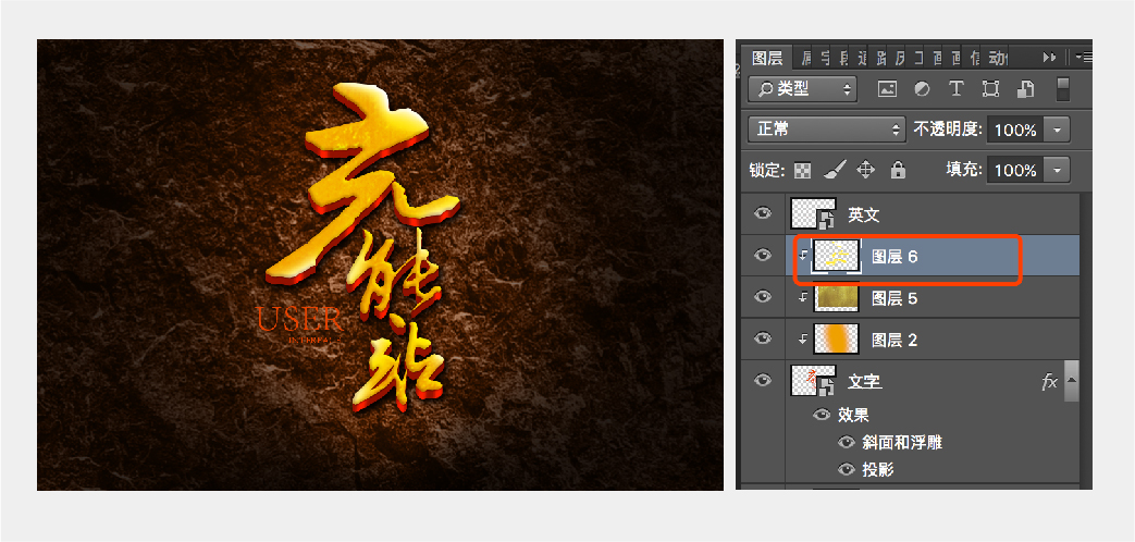 (3)给文字增加“斜面和浮雕”、“投影”等图层样式,打造立体效果。