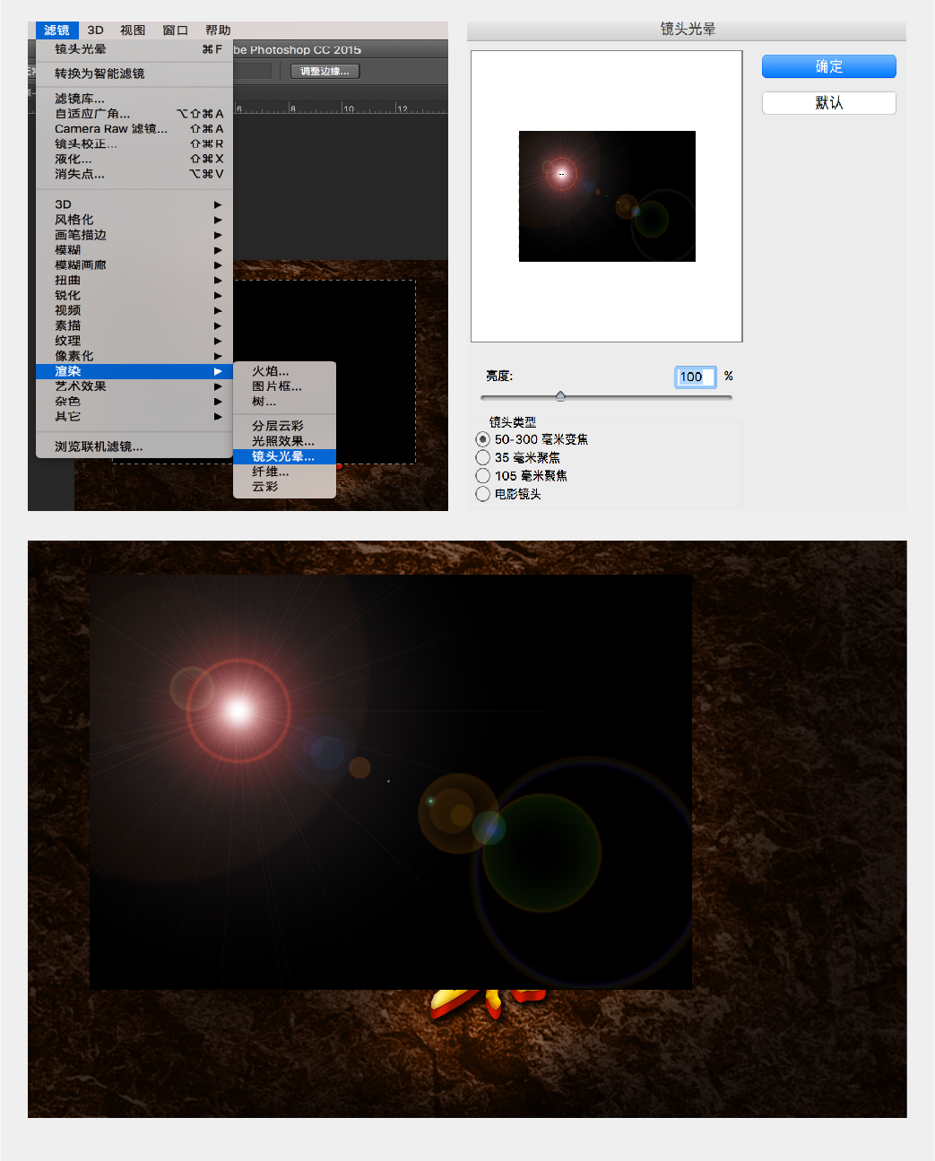 下面我们为文字增加光效,当然可以从网上找素材直接添加即可,这里我们自己制作一个,新建一个图层,用选框工具画出一个矩形,填充黑色,然后执行滤镜——渲染——镜头光晕,调整合适的参数得到如下效果: