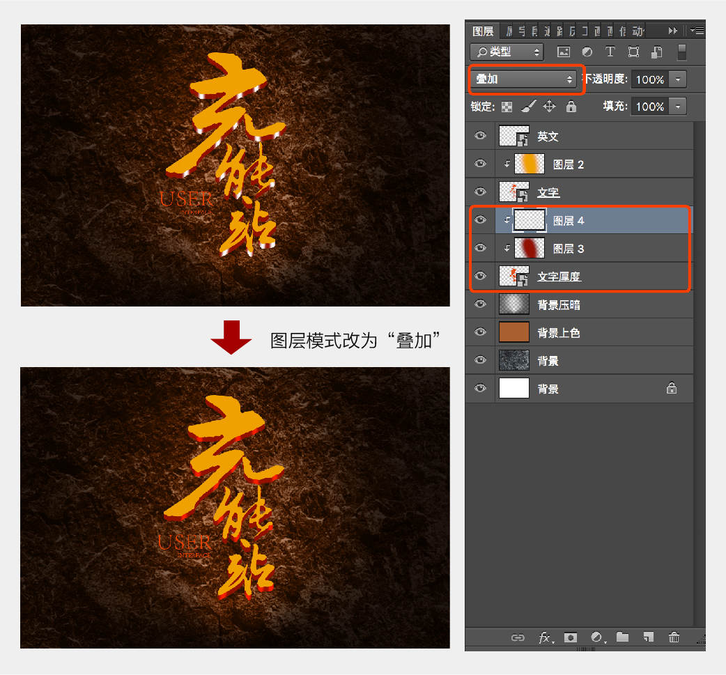 下面我们在网上找一张金箔素材叠加在文字图层上面,将图层混合模式改为“叠加”,效果如下: