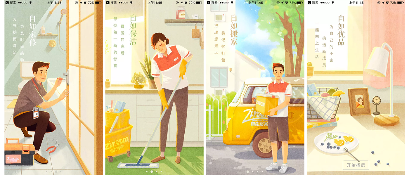 生活情感化,代入感非常强,自如这套引导页很有感染力