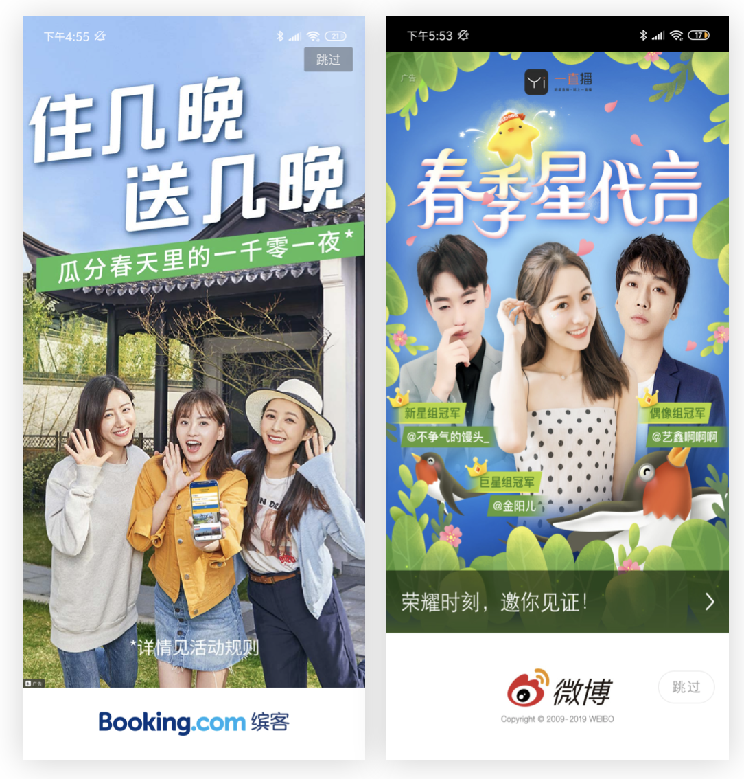 展示运营活动广告,时间较长,有交互行为,可点击进入,可点击跳过