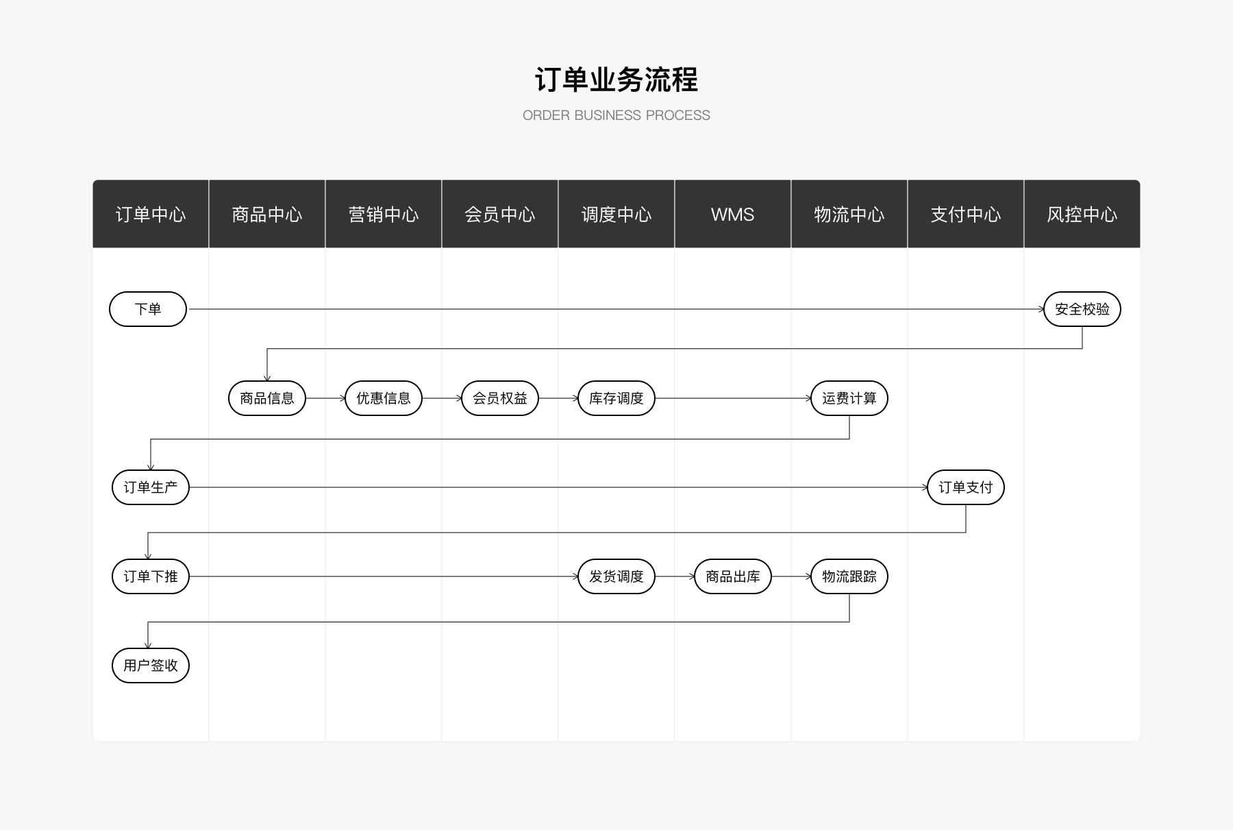 同样拿网购来举例,在实现模型中,从用户选中商品生成订单开始,该订单后台系统流转经历了订单中心、风控中心、商品中心、营销中心、物流中心、支付中心、调度中心等等,而这一切,在用户看来,他们只需要在家里等着就可以了。