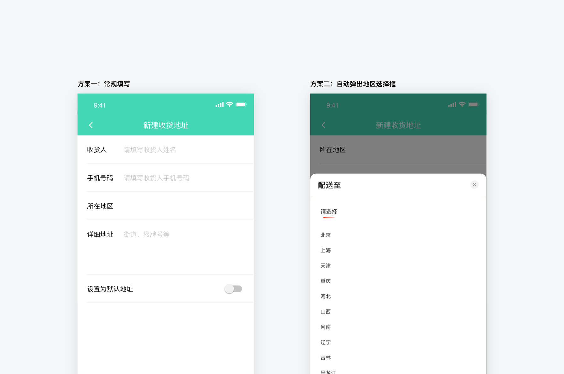 经常说细节决定成败,因为那一点点细节,就是打破用户心理认知的关键。例如在规划电商的收货地址管理模块时,对于添加收货地址流程,大家都不会陌生:输入姓名、输入手机号、选择地区、填写具体地址。但设计师会去思考,我们是不是能把流程再缩短一点,于是有了【进入页面后,直接弹出选择地区弹窗】的设计。