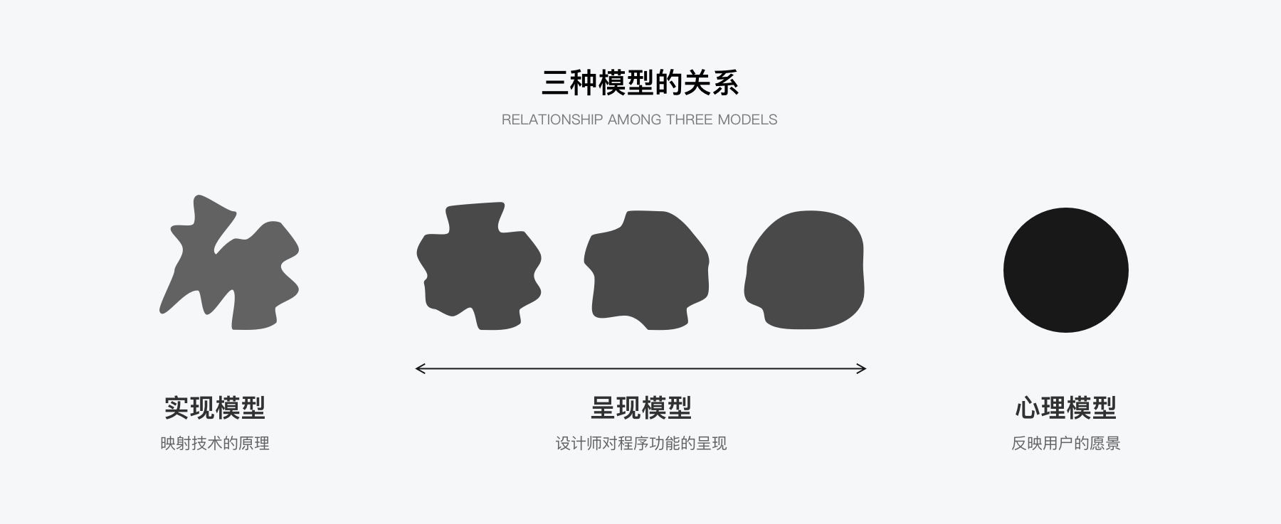 正如产品最初的三原则:功用性、可行性、称许性。功用性即技术可实现的,需符合实现模型。称许性即用户的满意度,需符合心理模型。可行性为产品设计师创造的,可支持商业模式,可持续发展并且能随遇到的不同状况变更的,即呈现模型。