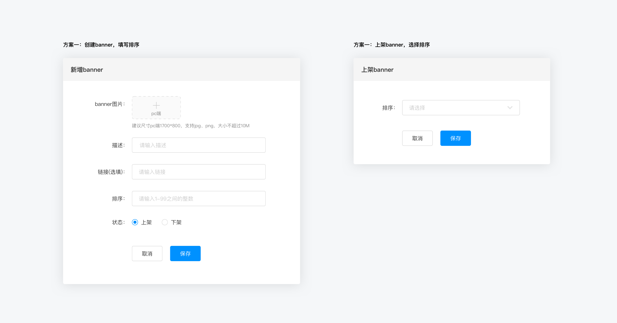 在给运营后台设计运营管理时,我接触过一种banner的上传机制,且不在少数。让运营人员在上传配置banner内容的时候,直接填写【排序】字段,再选择该banner是上架状态还是下架状态。这样,发布成功后,每个banner都有自己的状态与排序,当发现多张banner同时上架且排序相同时,再通过上传时间降序排列,即最新上传的排在最前面。