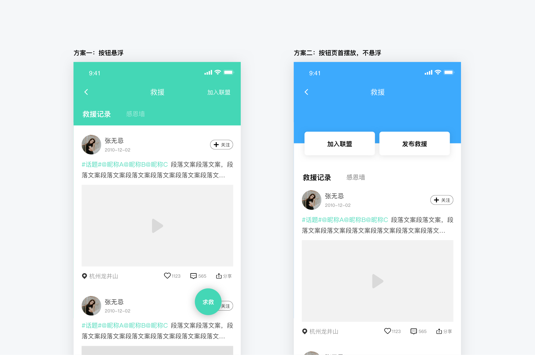 方案一的设计思路是当用户进入救援频道页后,右上角悬浮着【加入联盟】按钮,主体页面中,【发布救援】采用悬浮按钮的形式,保证了用户在浏览当前平台救援列表或感谢列表时,可随时申请加入联盟或发布救援。方案二则直接让两个按钮出现在页面第一屏最显眼的位置,虽然在视觉上加重了效果,引导能力更强,但是并不去做一直悬浮的功能。