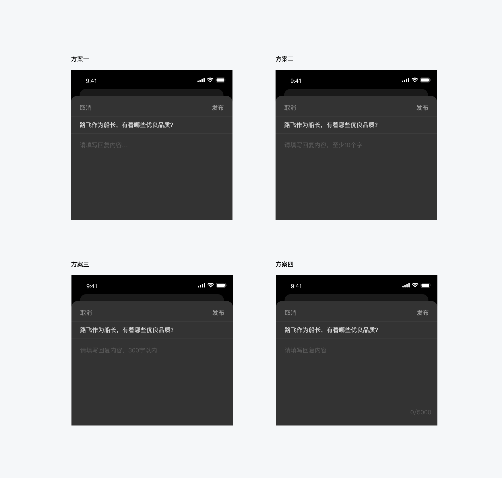 以字数限制为例,除非产品存在必要的特性,请尽量限制的展示。因为用户在浏览的过程中点击了回复按钮,说明在情感上产生了共鸣,不管这种情感是愤怒、喜悦还是其他,他们只想说点什么,但是打开回复页面后,过多的限制会让这种情感被打断、被破坏。例如方案三中,如果是一般论坛,正常的回复,用户很难会写超过300字的评论,所以这种提示是多余且负面的,甚至有可能让用户产生“我被限制住了想象力”的感觉。