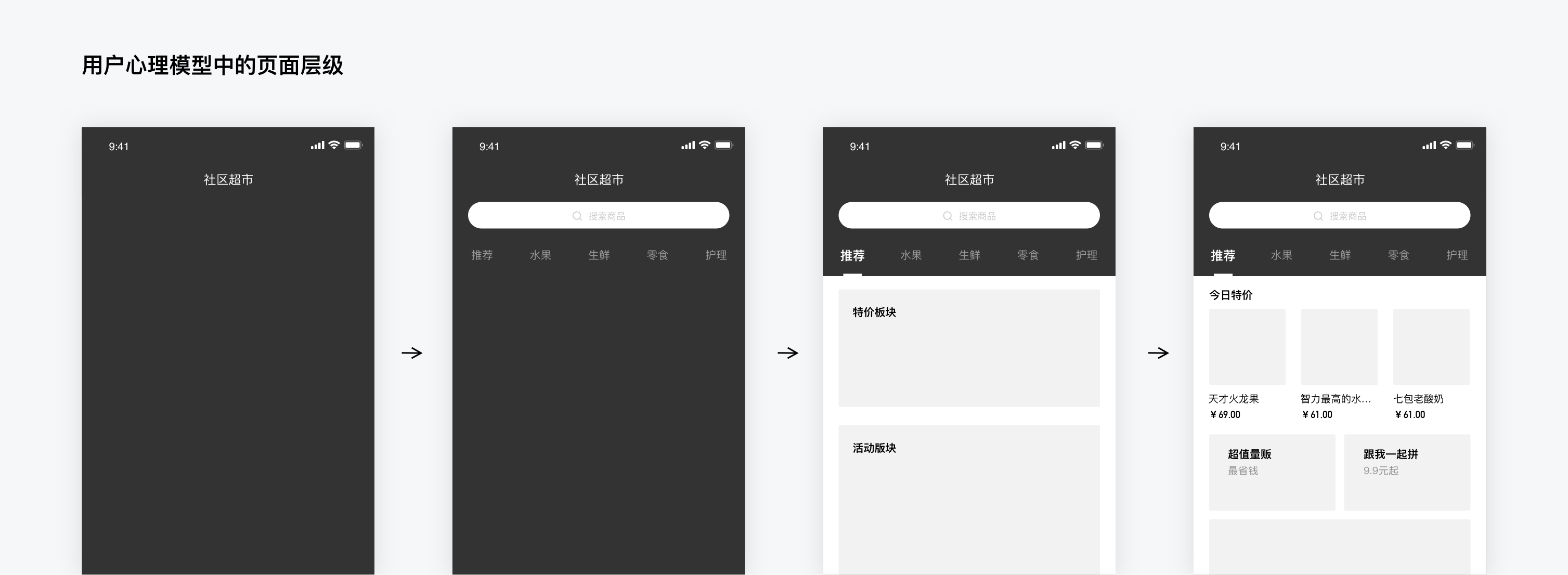 视觉风格的发展,也越来越注重产品层次予用户的感知。以 Material Design 为例,充满了高光、纹理、阴影,用户能直观得感知到卡片之间存在的层次关系。这种层次感在同一页面,表现于各个组件之间的叠加关系,在不同页面,表现于各操作逻辑、信息框架的主次从属关系。以电商首页为例,设计师对于搜索框是放在TAB条上方还是放在TAB条下方感到为难。