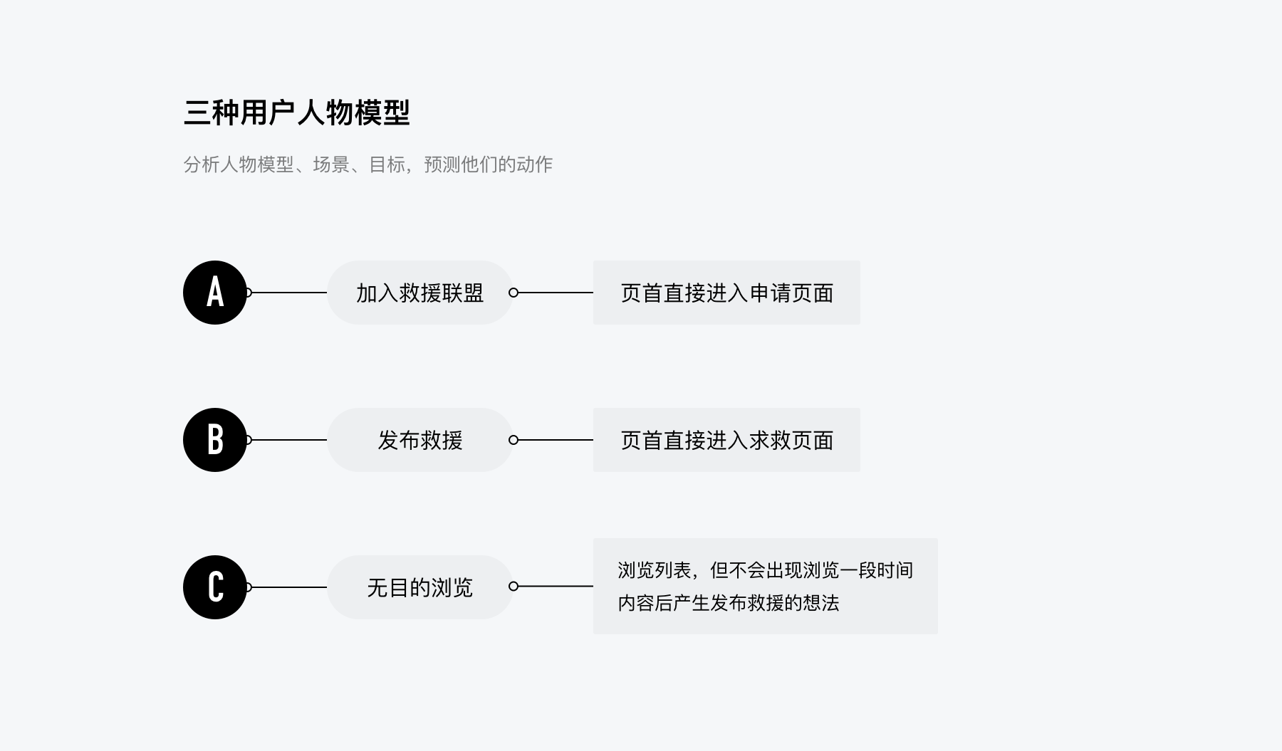 用户C,毫无目的地浏览页面。此类用户基本上是在一种比较悠闲或者抱着好奇心的情况下进入页面。此时两个主要功能键对他们来说基本是可以忽视掉的,他们更想要的是浏览救援记录或者感恩墙,所以肯定会进行上滑动作。也许我们在浏览微博或者朋友圈的时候,看着别人发的动态,引起兴趣或共鸣,会想着自己也去发布一条参与互动,但在浏览救援记录的过程中,他们并不会产生“我也发布一条救援吧”的想法。
