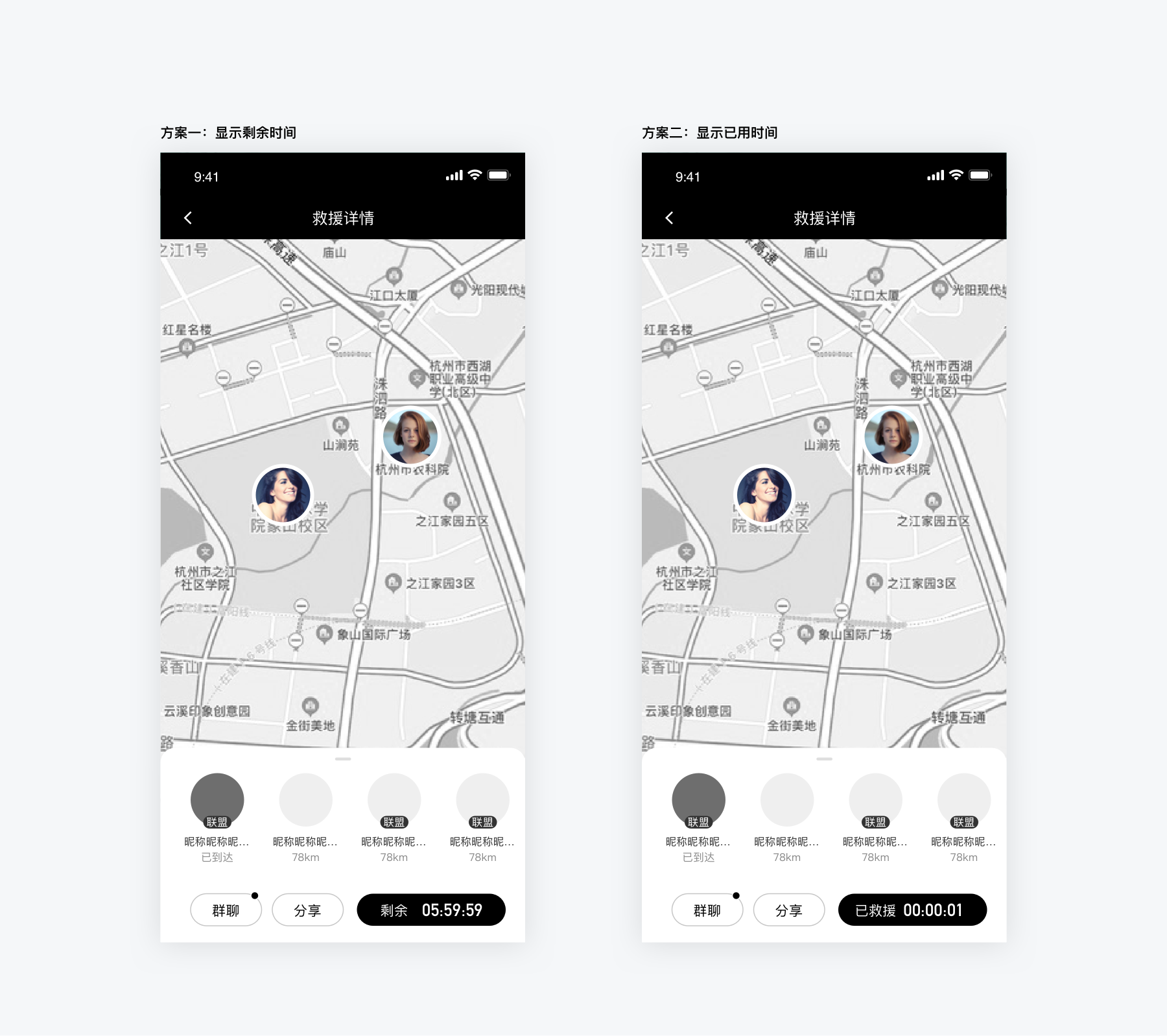 在设计用户救援流程时,当施救者已经抵达求救点时,系统会开始计时施救时间。求救者可以根据救援时间的长短以及救援质量给施救者评价与奖励,并且系统会有一套6小时后救援自动结束的机制。产品给到的原型中,直接展示了剩余的救援时间。与其给出已消耗的时间,不如给出剩余时间,这样的设计思路一般出现在为了给用户产生紧迫感的任务中,人们对未完成任务的记忆比已完成的更加深刻(蔡格尼克记忆定律)。通过对未完成的任务的提醒,来博得用户的注意力,进而达到商业目的。