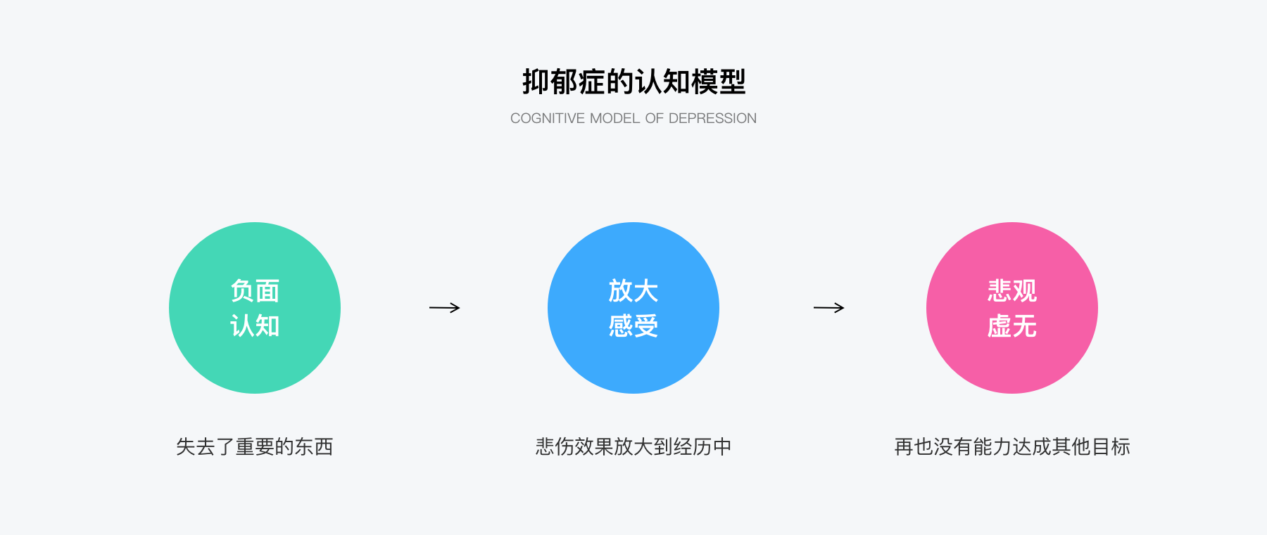 在治疗抑郁症患者的过程中,研究者Beck建立了一个认知模型(Cognitive Model),他认为重要的丧失让病人认为他失去了一些对他的快乐与平静很重要的食物,从而从任何重要事物中都感受到了负面效果,让病人认为自己没有能力去达到目标,从而形成认知三元 : 对自己的负面认知;对生活经历的负面感受;对未来的悲观和虚无主义。以此为契机,让病人患上抑郁症。