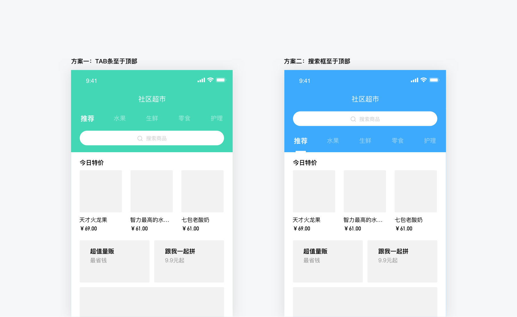 方案一种,将TAB条放置顶部,部分设计师考虑的是进入电商平台的用户一般带有一定的目的性去购买商品,所以点击搜索条的频率会更高,放在更靠下的地方实际上可以让用户手指更方便得点击到该屏幕高度;而TAB条可以利用页面整体地向左/右切换而实现。