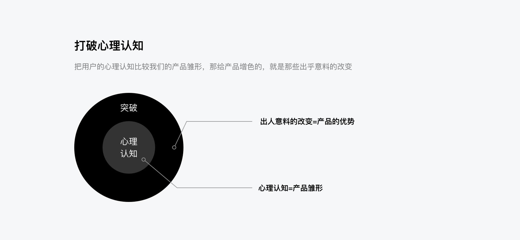 用户的大部分时间都花在别人的产品上而不是你的产品上,他们希望你的产品跟别人的有相同的操作方式和使用模式,这就是用户通过自己经验建立起来的心理模型,他们知道该怎么用,他们同样认为你的产品也可以这么用。但是,为了建立优势,产品需要创新,好的产品都是创新的,不同的,敢于尝试,但不是标新立异。打破固有用户认知,是为了构建更好的心理模型。