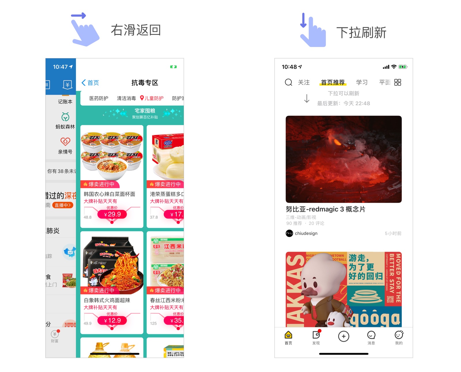 二是与普遍操作习惯保持一致,比如右滑返回、下拉刷新,是大众普遍认可和习惯的操作,在产品中也应保持一致的交互体验。交互方式的一致,让用户更容易使用和掌控产品,有利于建立对产品的信赖感。
