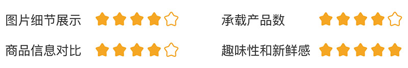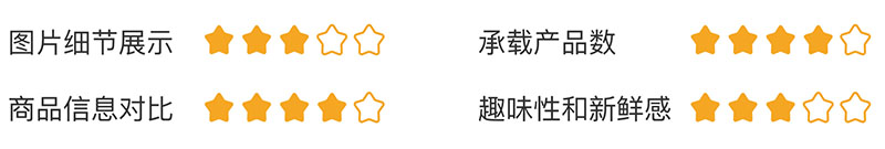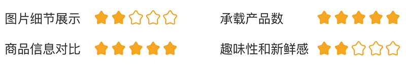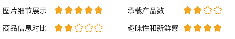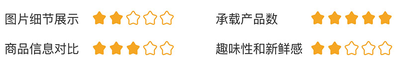 综上,如果满分是五颗星,那么三列网格布局的图片细节展示较弱为2颗星;承载产品数非常多为2颗星;商品信息对比较弱为2颗星;趣味性和新鲜感较好为2颗星。