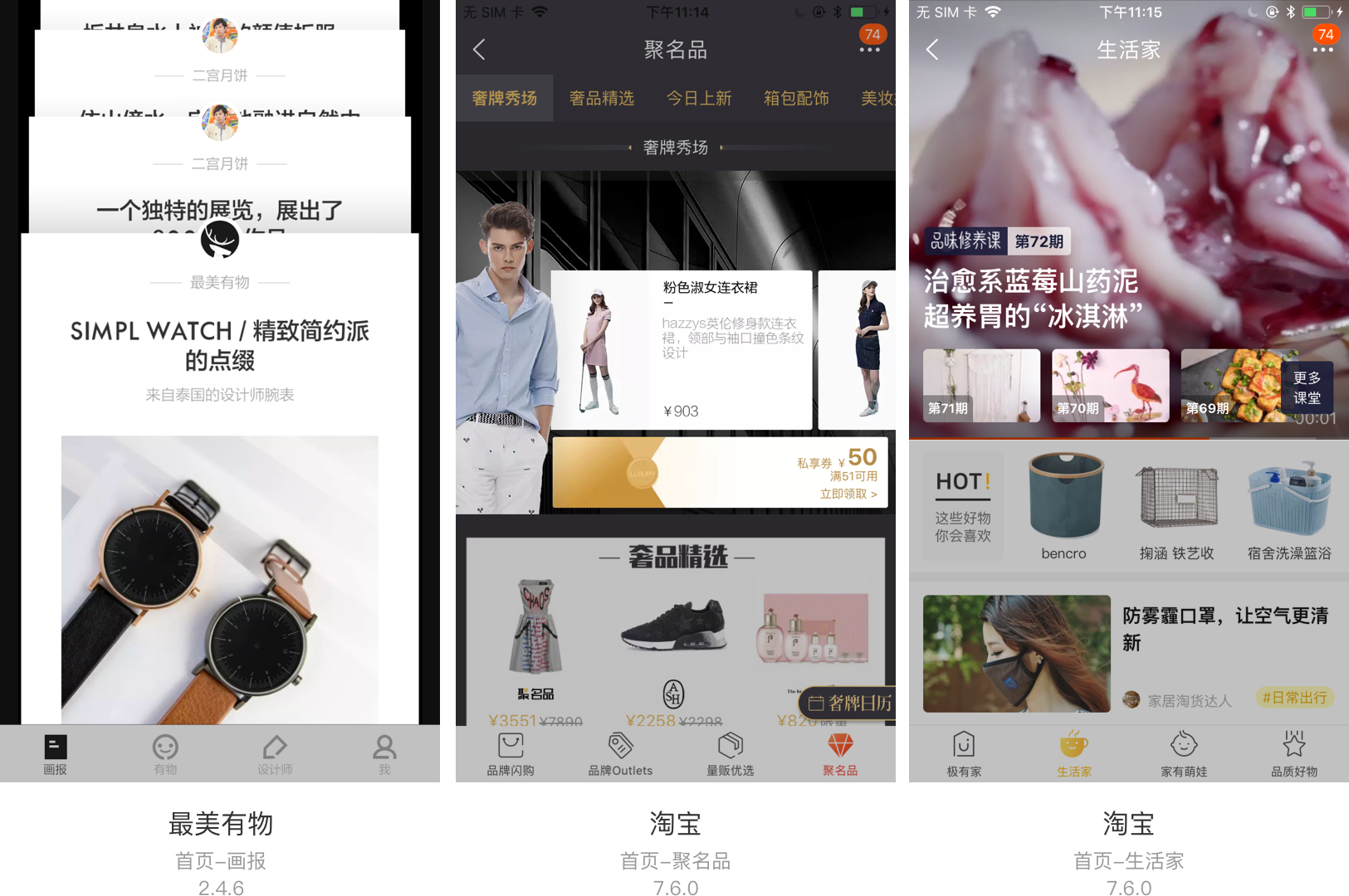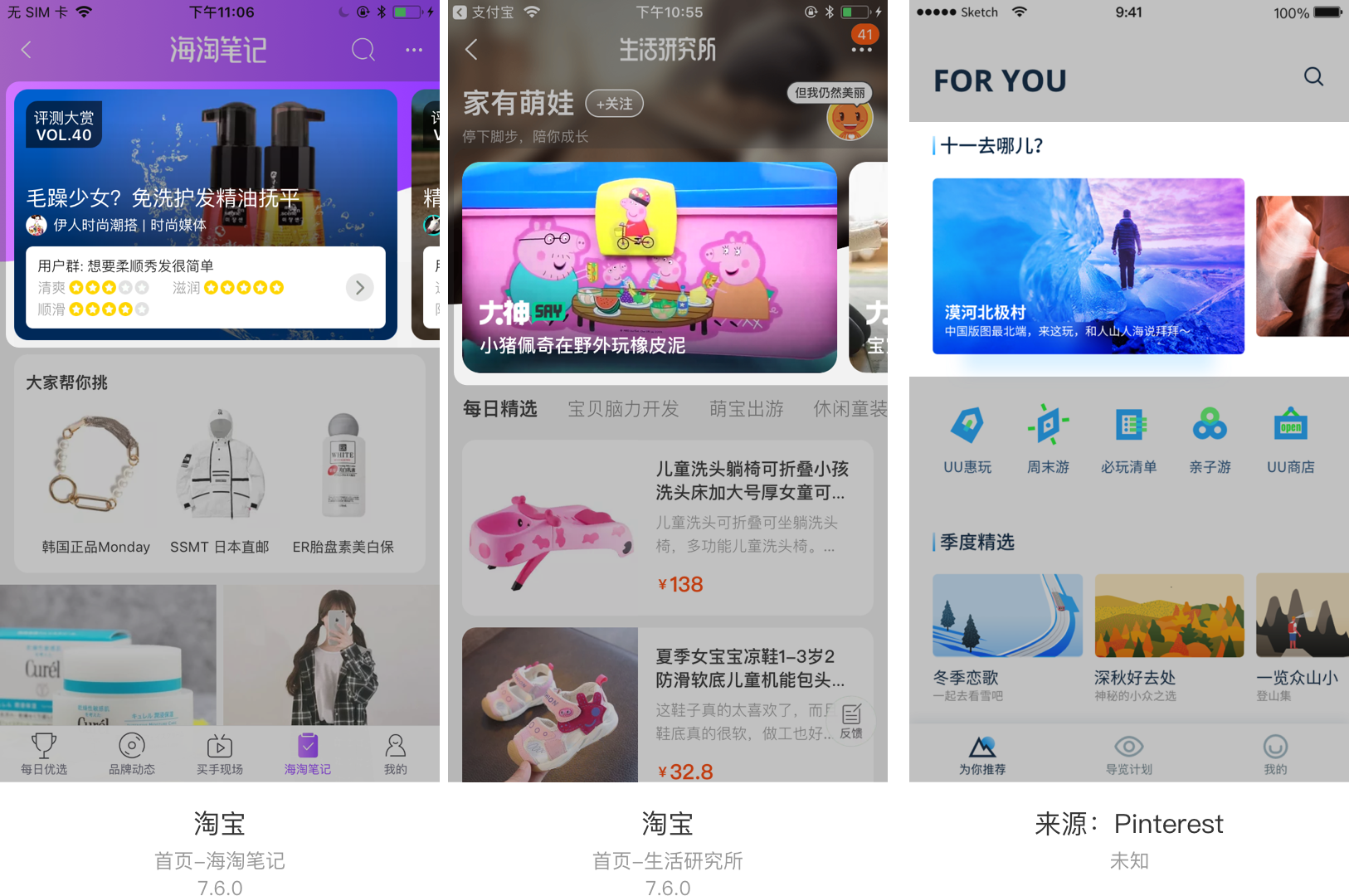 信息展示类侧滑分为常规图文类、图片嵌套卡片式信息的形式和视频展示类。例如:淘宝的海淘笔记页面为图片嵌套卡片式信息的形式,淘宝的生活研究所为视频展示类侧滑,也就是滑动到哪个哪个Banner可以自动播放视频。一般信息展示类侧滑多用于产品的二级页面。