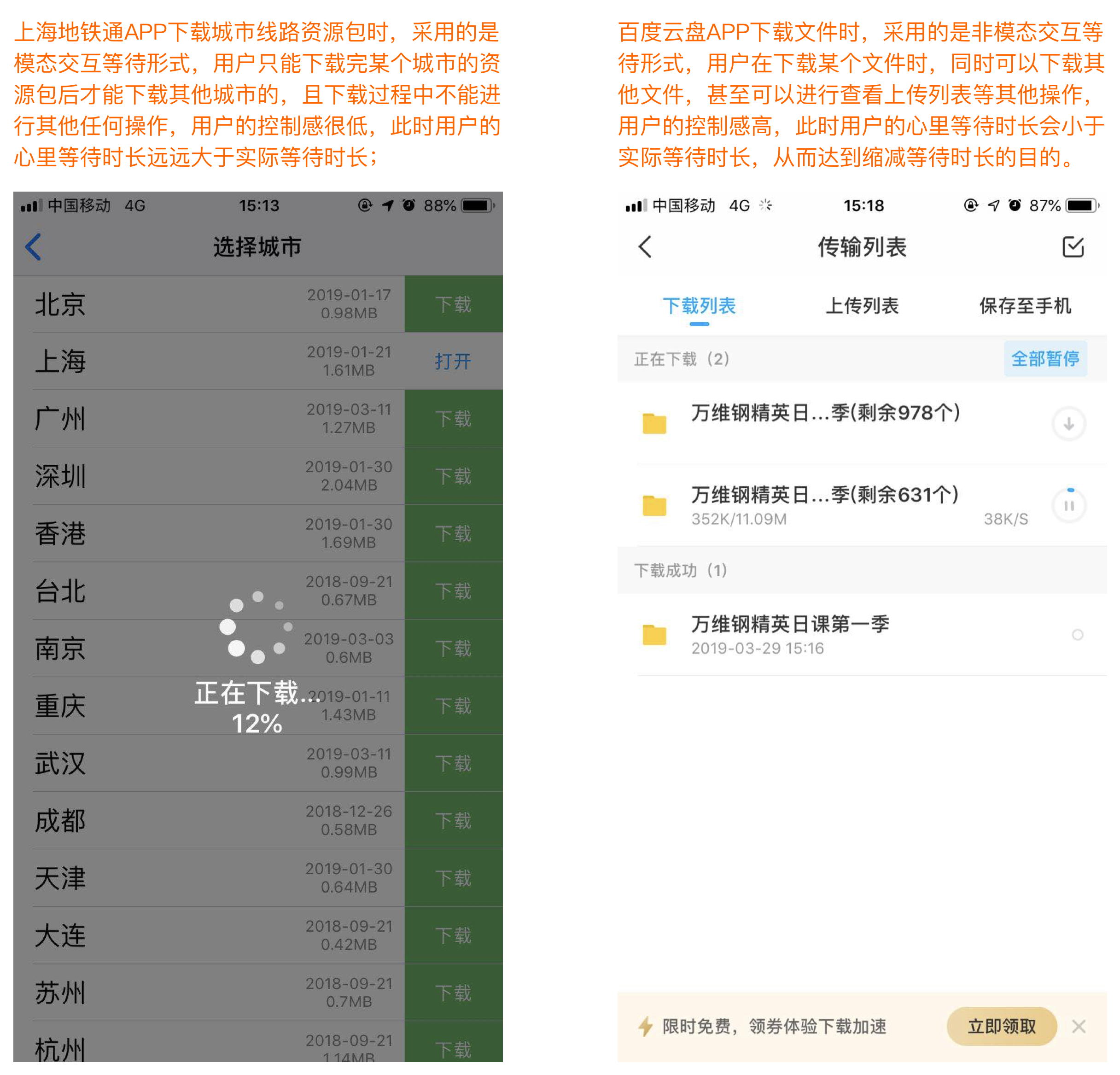 例如:有些产品在等待的过程中采用的是模态的交互形式,用户只能一个任务一个任务的去完成,这样显然增加了等待的负面情绪。针对这种情况,建议将使用非模态的交互形式,让用户可以同时操作多个任务或者取消任务,这样会弱化用户等待的心里感知,达到“缩减”等待时间。