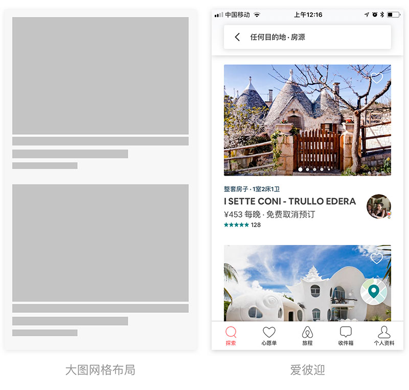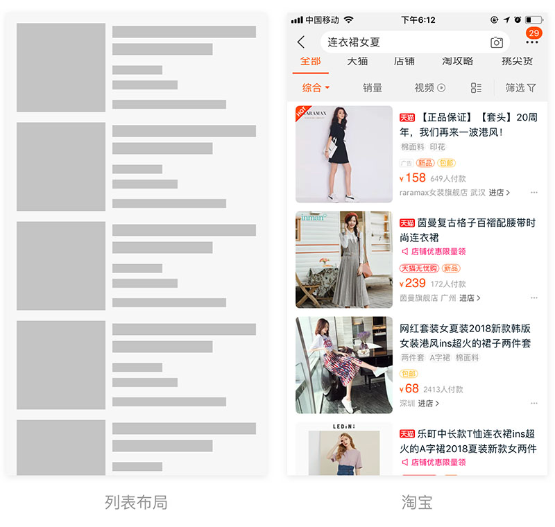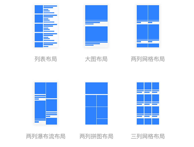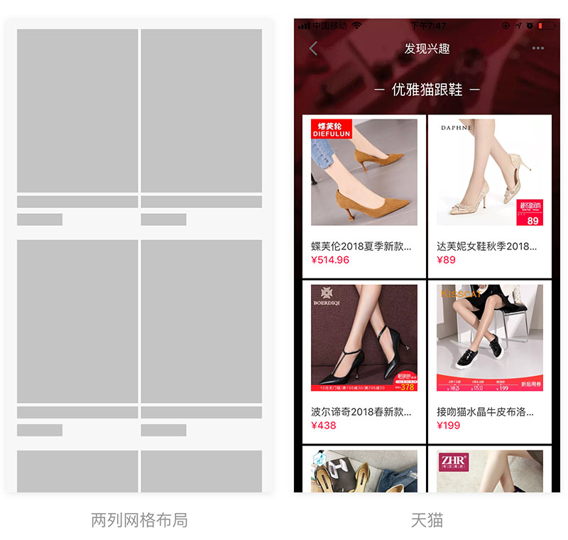 三列网格布局主要用于用户无目的操作,产品数量较大时使用,和列表式的区别是列表式以文字为主进行对比。而三列网格布局其图片对比和文字对比都较弱,往往用于用户目标不明确,需要通过展示大量图片供用户选择,同时图片对比性质教弱的产品。