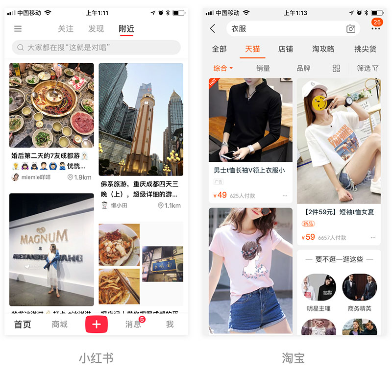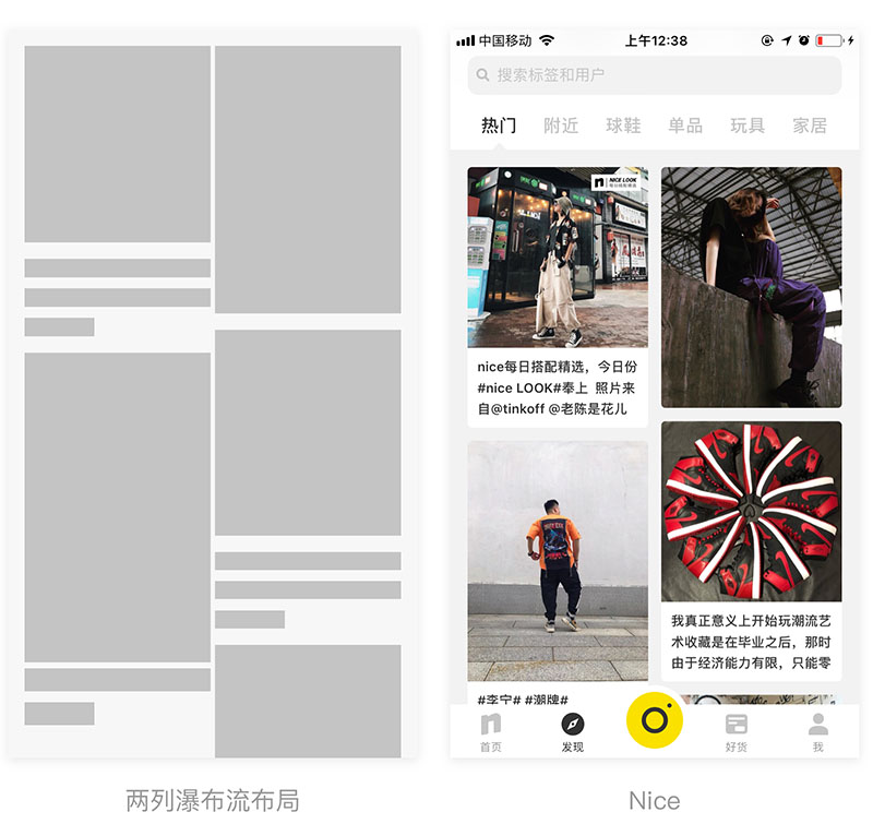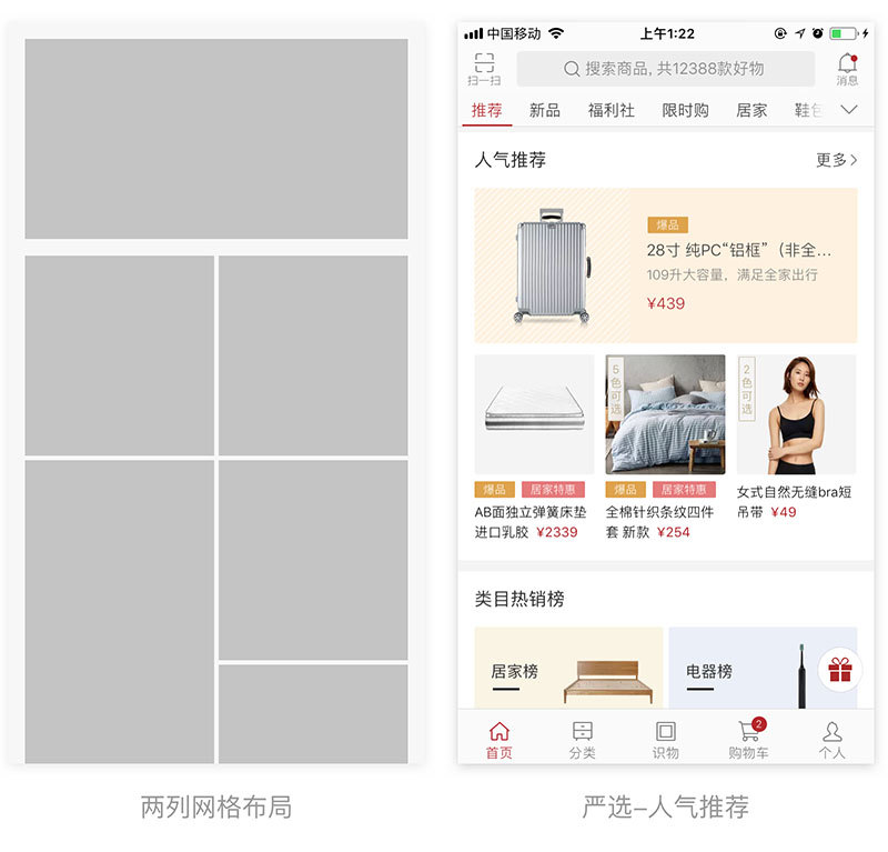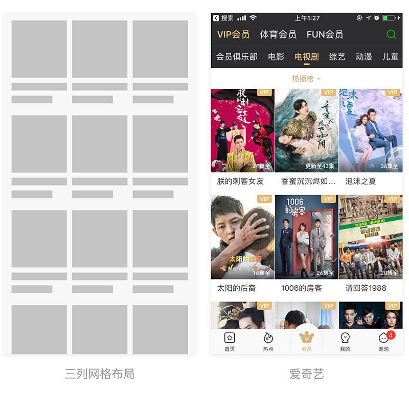 三列网格布局主要用于用户无目的操作,产品数量较大时使用,和列表式的区别是列表式以文字为主进行对比,而三列网格布局主要以图片进行对比。