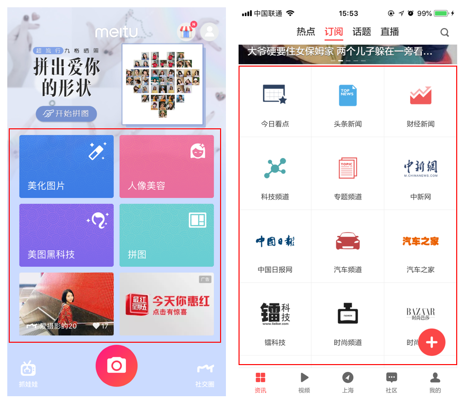使用这种导航样式最具代表性的就是美图秀秀了,这类导航在视觉上比较整齐直观,方便用户快速查找,同等级功能之间割裂感比较大又或是功能之间没有很大的关联可以采用这种导航形式;