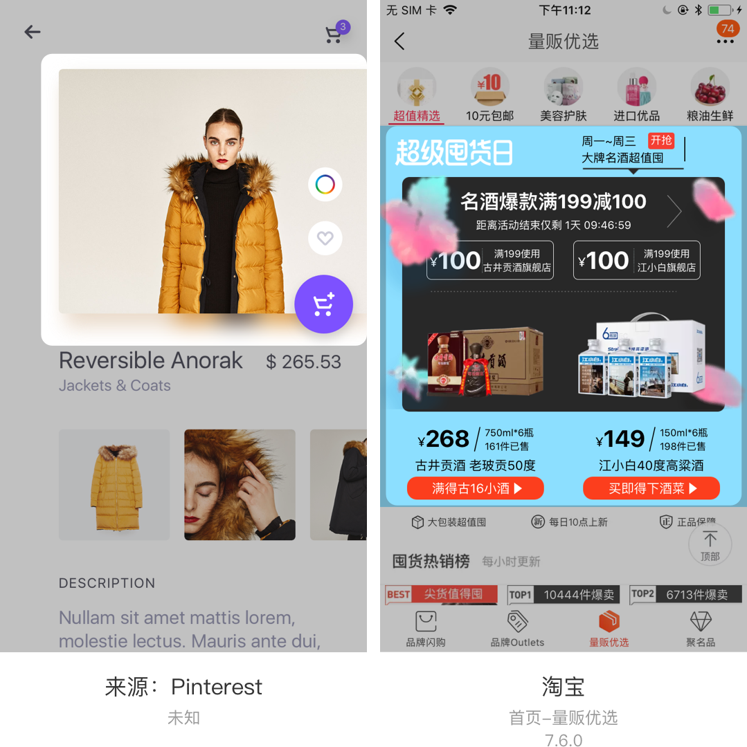 图文错开类样式一般适用于想要有个性化页面展示的App,相对于其它中规中矩的App有更多的创意类元素可供发挥,例如:上图图一的卖比较个性类别的服装。