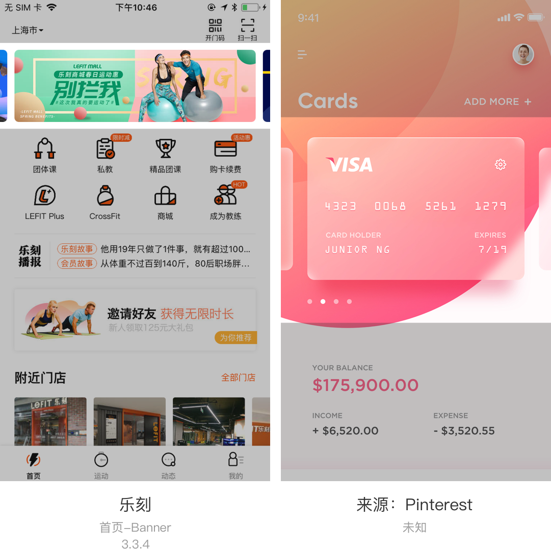 上图的乐刻App首页采用的为大小一致平行轮播、第二个为景深类轮播、第三个为景深类异形轮播、最后一个为一致类弧形轮播。一般拓展应用的话会采用文字等特殊排版来进行一致性统一。